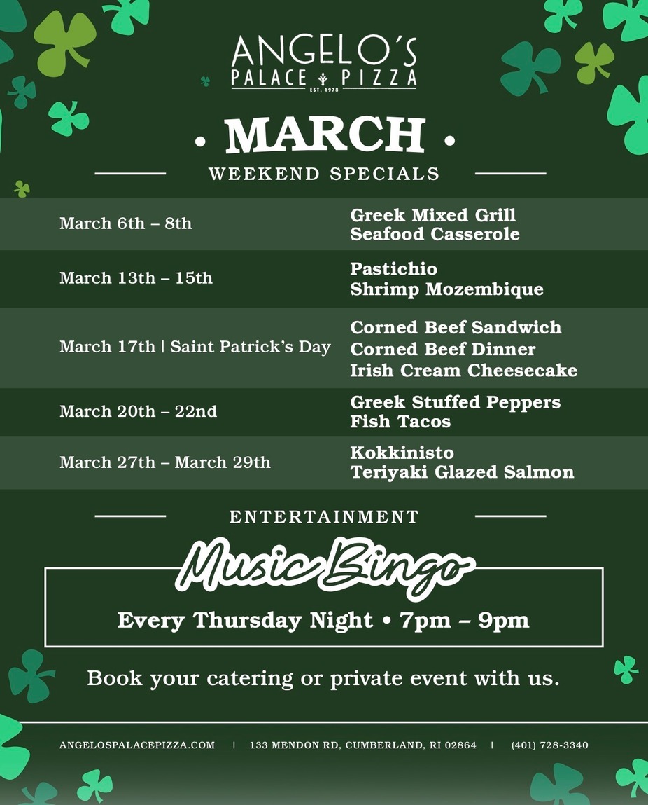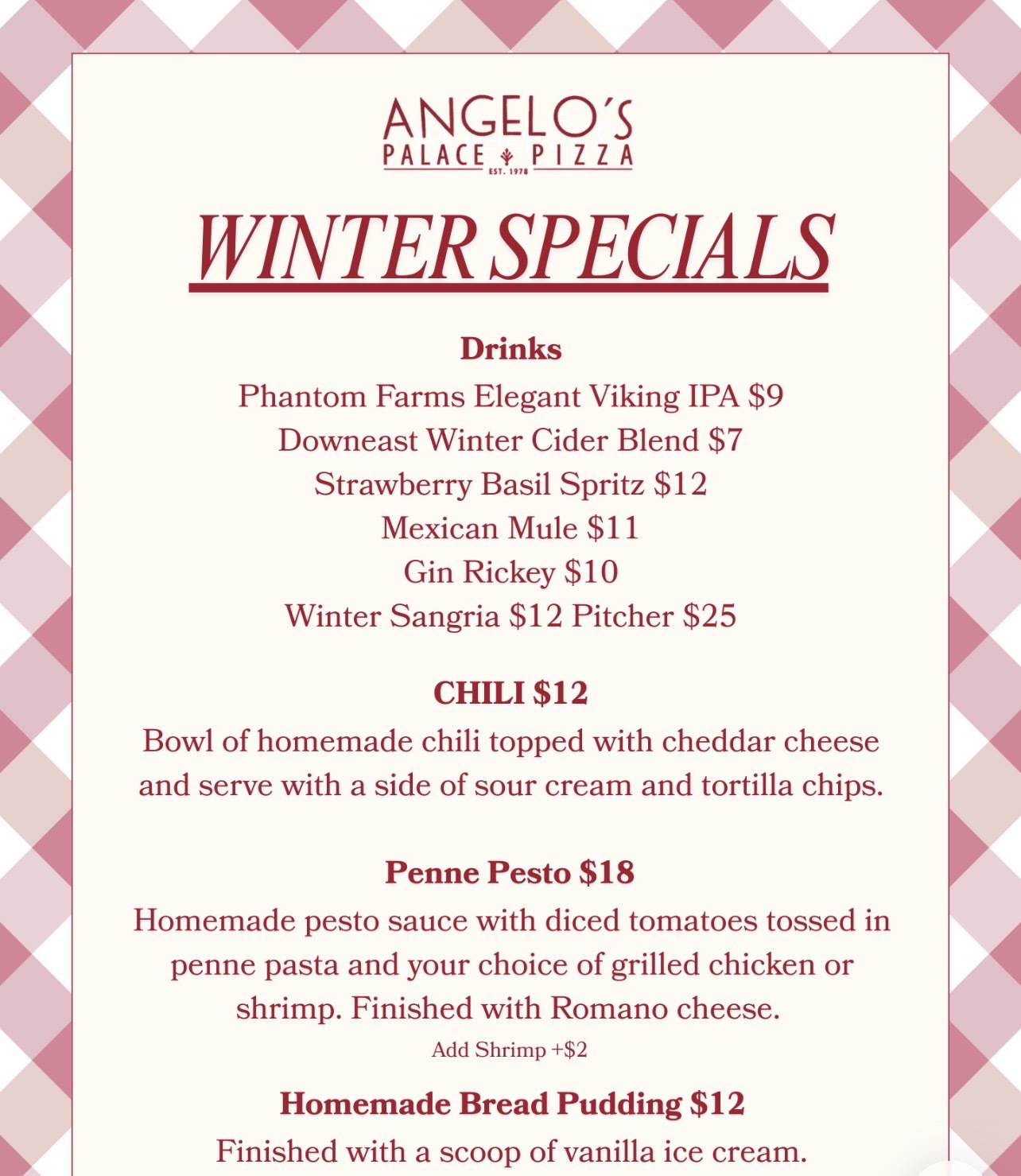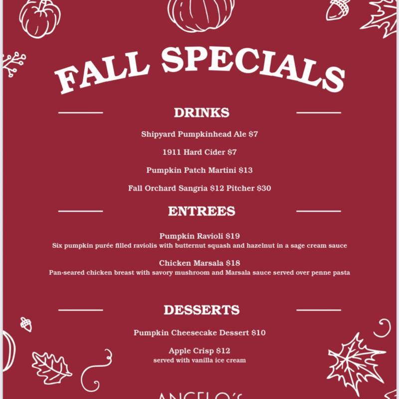 Angelos is a place that is always consistent. The atmosphere is very welcoming. My favorite time to go is the summer as they have a very nice outdoor patio. While their menu is pretty standard, they also rotate in a seasonal menu of food and drinks...